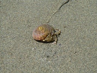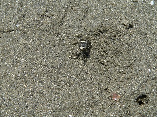 【左】ユビナガホンヤドカリ (宿貝はイボキサゴ) 【中】マメコブシガニ 【右】ニホンスナモグリ