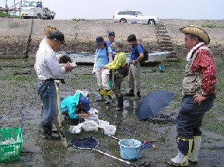 【左】採集したものを調べています。 【右】干潟の生き物の観察は、スコップが必需品です。