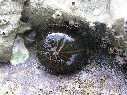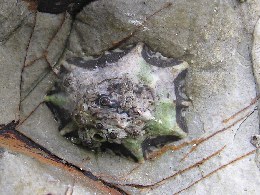 【左】ヨメガカサガイ。カサガイの仲間は吸盤で岩に張り付いています。