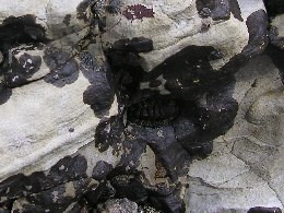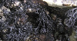 【中】コールタールみたいに岩に張り付いているイソハンモンという褐藻類です。