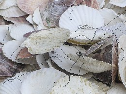 【左】ホタテの貝殻に糸が通してありました。ノリの種付けに使われたものです。