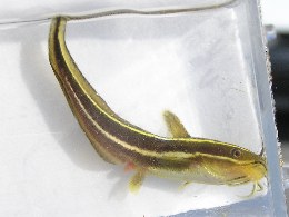 【右】ゴンズイ。食べるとおいしいですが背ビレ・胸ビレの前部に毒針を持っています。強い毒があり、死んでも毒があります。