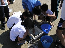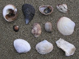 【中】上左からツメタガイ、ムラサキイガイ(外)、シマメノウフネガイ(外)、コベルトフネガイ。中左からヤマトシジミ、アサリ、ハツユキダカラ、アカガイ。下左からバカガイ、ウチムラサキ(別名オオアサリ)、マガキ。(外)は外来生物
