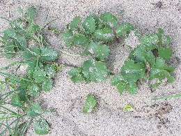 【右】海浜植物のハマダイコン。新しい芽生えで、来年初夏に花を咲かします。