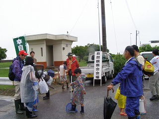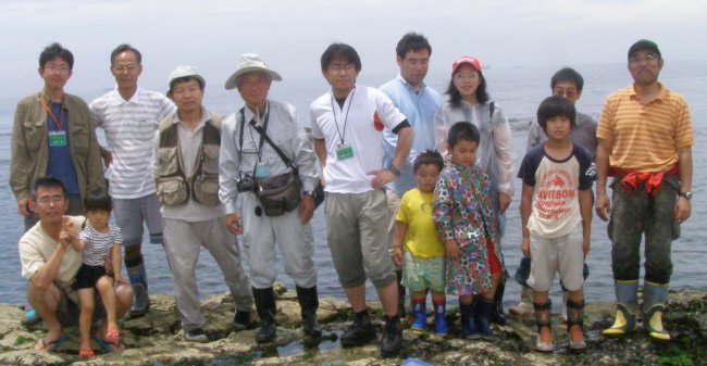 朝からの雨。観察会開始の直前に何とか雨もあがって中止は免れましたが、雨に出鼻をくじかれ、参加者の数は例年になく少ないものでした。雨を心配しながらも何組かの家族がみえて、磯での生物とのふれあいをみなさんと楽しむことができました。今回の観察会ではいつも見られるものに加えて、縞模様がきれいな南方系の魚「カゴカキダイ」の幼魚を観察することができました。(記・永田)