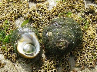 【右】イワフジツボとイボニシ。イボニシはフジツボを食べます。
