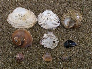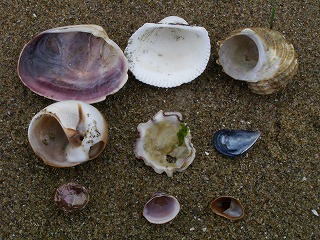 【左】漂着した貝殻、左上からウチムラサキ、サルボウ、サザエ、中:ツメタガイ、マガキ、ムラサキイガイ、下:ナミマガシワ、シオフキ、シマメノウフネガイ