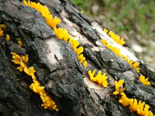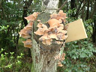 【左】キクラゲ。たいへんおいしそうでした。当然、いただきました 【左】針葉樹の枯れ木に生えるツノマタタケです。