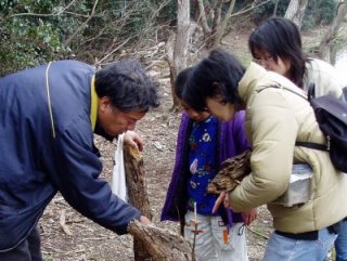 朽木の虫の観察会にたくさんの方が参加していただくのはありがたいことですが、往々にしてクワガタムシ、カブトムシの採集が主になってしまいます。これを少しでも避けるため、観察に入る前に森に住む生き物のお話をしました。 まず、クワガタやカブトは森があるので見られるということを認識しましょう。次に森の中には、クワガタとカブトだけが生きている訳ではないことを知りましょう。クワガタもカブトも何かを食べて生きているのです。これらは主にキノコが生えて、柔らかくなった樹木や落ち葉を食べているのです。また、クワガタとカブトは同じ場所では生活していなく、競争を避けるために硬い木にカミキリが、次に硬い木にクワガタが、そして、もっと柔らかいところにカブトが生活しています。次に、カミキリやクワガタが住んでいる木の周りが腐って褐色になり、柔らかくなっているのを確認しましょう。そんなところにアリ、ムカデ、ハサミムシ、ゲジ、ダンゴムシ、ヤスデ、ミミズなどが生活しているのが見られます。アリ、ムカデ、ハサミムシ、ゲジなどは小さな動物を食べていて、鳥さんに食べられます。ダンゴムシ、ヤスデ、ミミズも同じように鳥さんの餌になるのです。森の中には、獣、鳥、虫、植物、キノコなどの生き物がたくさん見られ、これらが食べたり食べられたり、助けたり助けられたりして生活しいる大切なところなのです。(降幡記)