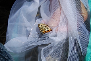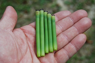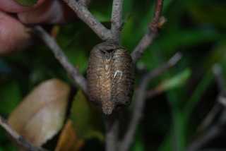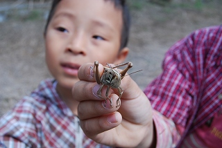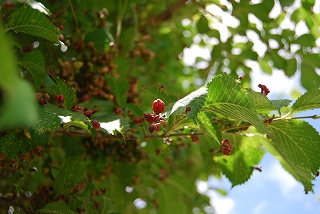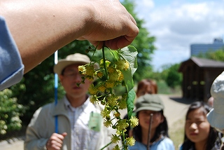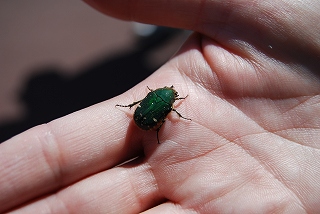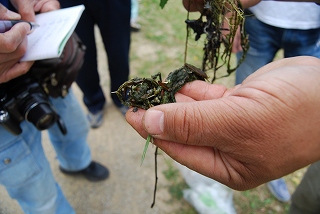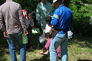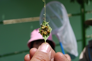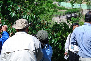 枯れかかった木の幹に丸い穴発見。人差し指が入るくらいで下に向かって伸びている。家主がおらず、指をつっこんでも指されなかったが、クマバチの巣であった。コゲラの穴はもう少し長○なので区別がつくようである。オオシマザクラにいっぱい実が付いていた。おいしいのに当たると少し甘いが、そうでないとちょいと渋い。口に入れた人の顔がそれぞれの味を語っていておもしろい。ガマズミにモミがいっぱいついていた。シイの花っぽいにおいがしてエサキモンカメムシが何匹も見られた。どちらも「かぐわしい」においで、虫たちにはごちそうのにおいなのだろうと思う。水際の土手一面に生えるトクサの新芽たちがなんともかわいい!ついつい手に取ってしまう。湿地帯に生える、芦の茎に茶色い足早の蜘蛛が・・・あとで原先生にたずねるとイオウイロハシリグモとのことだった。低い生け垣に巻き付く草の茎に金色の物体が・・・と、思いきや、平松さんはこともなげに「ジンガサハムシ」だよ。と、教えてくれた。遠目に見ても、緑の中に大きな花が・・「アブラギリの花」だった。帰り際、なだらかな土手をあがる途中に蒼いヒナギキョウの花たちを見つけた。(記・竹内秀)