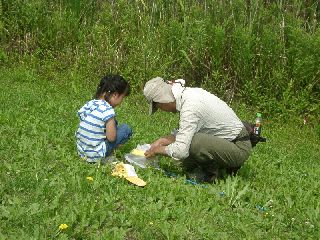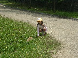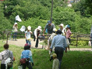 事務所前の花壇にヒマが植えられていた。ひまし油のヒマで、戦争中には種からとった油を燃料にしたとか。今はやりのバイオ燃料を今から60年前にやっていたと思うと、きっかけはどうであれ先端技術?をいっていたわけですね。垣根にはたくさんのタナグモ。巣をちょっとさわってやるとあわてて偵察に来るものの、すぐに引き返して巣の奥に鎮座。やっぱり指は食えないか。途中、枯れかかった木の幹に丸い穴発見。人差し指が入るくらいで下に向かって伸びている。家主がおらず、空き家からヤスデが出てきた。カレハガの仲間の幼虫の体からハチのマユが続出。幼虫は一回り小さくなっていたが、体は動いて威嚇していた。オオシマザクラにいっぱい実が付いていた。おいしいのに当たると少し甘いが、そうでないとちょいと渋い。口に入れた人の顔がそれぞれの味を語っていておもしろい。歯が真っ赤になっていて、鏡で自分の顔を見てニーッ!椿にヒノキバヤドリギがいっぱいついていた。たくさんつかれると、さすがに「やどぬし」もつかれるようで、葉が黄色くなっていた。水際の土手一面に生えるトクサの新芽たちがなんともかわいい!ついつい手に取ってしまう。節で笛が・・・下の方に行くほど音が低くなり、さながらとくさケール?湿地帯に生える、芦の葉をまいて蜘蛛が・・・ヤマトコマチグモ。かまれると痛いが、おかあちゃんは卵を守り抜いて孵った子どもたちに自分の体を食わせて子どもを育てる。子を育てるメカニズムののすごさ・・・孵ったばかりのヤンマの仲間や、アジアイトトンボ、コシアキトンボがみられた。湿地帯ではヨシキリがよくきたヨクキタ、ギョギョシと鳴いていたが、子どもたちはそんなことは耳に入らずモンシロチョウと戯れ、とれたといって大騒ぎ。ヤナギの樹液に「オオスズメバチ」がよく見られた。結局湿地帯を1周して時間切れとなった。(記・竹内秀)
