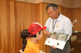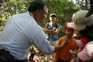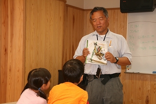 二つ池セレトナ主催、募集のネーチャーゲームをメインにした観察会でしたが,地区の公民館行事と重なったためか参加者は少なかったです。(地域の小学生はO人) 参加者が少なかったのでゆっくりといろいろな自然を味わう観察会にしていきました。最初はカモフラージュを本の写真から見つけてみようという活動をしました。どれほど興味を持つか心配でしたが,これで楽しい経験ができた子どもたちはとても意欲的に生き物探し,隠れたもの探しをしていってくれました。大人も引き込まれていきました。