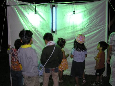 大きな台風16号が九州の南にあり、暖かく湿度の高い暖風が吹いていましたので灯火採集には最高の条件ではありませんでした。しかし、桧原公園の周りは森、水田、草原で自然に変化があり、周りは人家も少なく明かりが無いので灯火採集に好条件の場所でしたのでたくさんの虫を見ることができました。また、ほとんど宣伝をしてないことから毎年参加者があまり来ません。しかし、ことしはグリーンマップの友達がたくさん参加してくれたので楽しくにぎやかな観察会をすることができました。