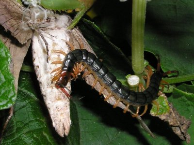 【左】トビズムカデも何か獲物を狙って上まで這い上がってきていました。