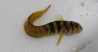 【左】ギンポの仲間のナベカです。    【右】左ナミイソカイメン、右イボニシの卵です。