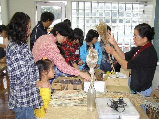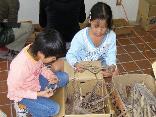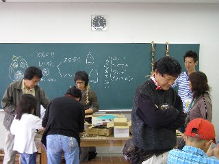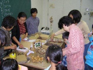 前日からの雨。遊園地での工作は無理。観察会は中止。しかし、この行事は常滑市青少年体験活動支援センターと合同で開催をした。そのため、会場を青海公民館に移し、工作だけになってしまった。城山公園で木の実を見たり、拾ったりが出来なかったが、あらかじめ用意していた材料。松かさ、落ち葉、椿の実 フジの実やサヤ、木の皮、ススキ、小枝、ヤマノイモの種が飛んだ跡、メダケ、いろいろな蔓、子供たちは楽しそうにリース、置物、ブローチ 写真立てなどを作った。指導員が大きなシイの実を持ってきた。公民館で炒ってみんなで食べました。シイの食べかすの皮をフクロウの鼻に付けた人もいました。最後に一番良く出来た作品を手に記念写真を撮って解散。(記・中井三)