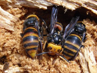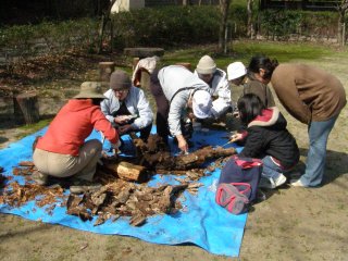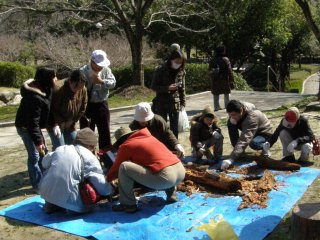 公園東入り口より少し入った広場にシートを広げ、林のなかより朽木を皆で集めた。浅井指導員は“この木には虫がいそう” “これはちょっと無理”と倒木を見ただけでめぼしをつけていた。広葉樹 針葉樹、木の種類によっても入っている虫も違うそうです。広場に集めた朽木を注意しながらドライバーで皮を剥ぎ、次々に虫を見つけた。杉の朽木からコガタスズメバチが現れ、じっとしていましたが太陽の光を浴びて暖かくなったか?大空へ飛んで行った。虫たちはプリンカップに入れて全員で、平松(俊)指導員より名前などの説明を聞いた。コクワガタを家で育ててみたい参加者がいて、飼い方を聞きコナラの朽木と一緒に持ち帰った。11:30参加者全員記念写真を撮り解散。