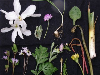 【右】テンプラにされた材料。左上からシデコブシ、ハハコギサ、レンゲ、ノビル、ガマ。下の段カキドオシ、アリアケスミレ、ヨモギ、ツクシ、スギナ、ハルジオン、トウカイタンポポ、、ヤブガラシ、ワラビ。