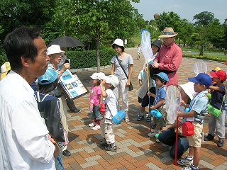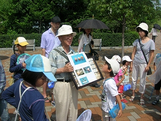 しあわせ村での観察会第2回目ということで参加者が多く,小さな子を連れたお父さん,お母さんたちも多くすごい熱気でした。東海市内でも標高が高く,起伏に富んでいて池を囲んで緑も多く虫取り目的できた人が多かったようです。今回は原先生が多数のカタツムリ標本を持ってきてくださり最初にみんなに説明いてくださったので,みんなびっくりしていました。