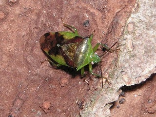 【左】アオモンツノカメムシ(ムクノキの樹皮下にいました。針葉樹、広葉樹どちらの樹皮下にも見られます)