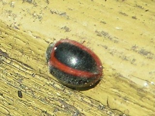 【左】ベニヘリテントウ(メルヘンの森のベンチにいました。オオワラジカイガラムシの天敵だそうです)