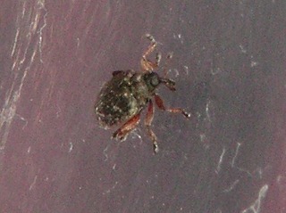 【右】アカアシノミゾウムシ?(体長3ミリ。名前のように後ろ足が太く飛び跳ねます)