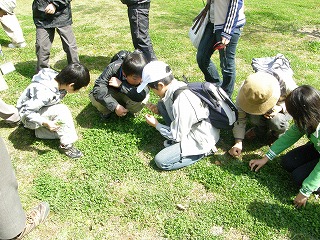 【左】園内の花木観察  【右】樹木に付いた虫を観察