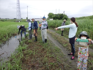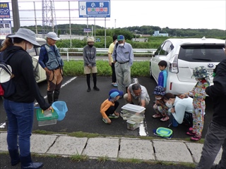 【右】昨年、ここで採った魚を自宅で飼い、本日、放流のため持参した水槽を参加者が持参した。それを観察