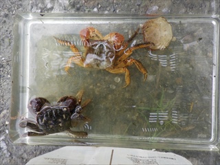 【中・右】つかまえた脱皮後間もないカニさん(ベンケイガニ、クロベンケイガニ)。脱皮殻もあった(写っている)