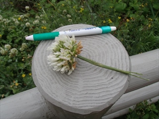 【左】雨の中、出発です  【右】異様に大きなシロツメクサの花がありました