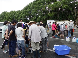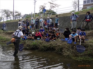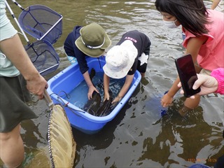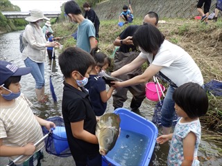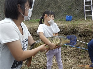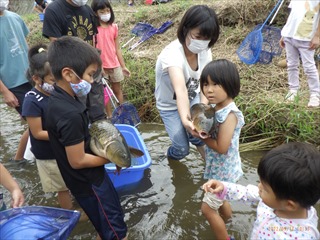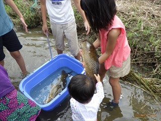 今回は、初めて、大きな "鯉(こい)" が二匹捕れた。大きすぎて、説明会場まで運ぶのが大変なため、川の中で "鯉との触れ合いタイム" をした。子どもたちの多くが、さわりたがって、順番にさわったり抱っこしたりしていた。