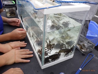 【左】お魚と触れ合う 【右】説明。手前…魚類、向こう…魚類以外の生きもの