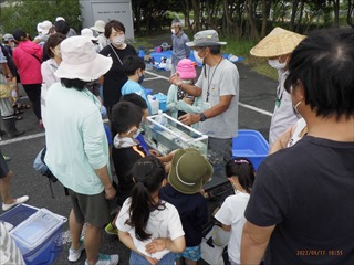 例年通り、主催者の挨拶とお話、指導員のお話、続いて、川に降りて、魚などのつかみ方の説明の後、川に入って、家族単位で頑張りました。