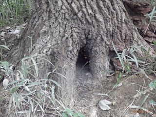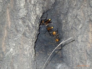 【左・右】散策路脇の木の根元にスズメバチの巣。お子様家族は前を通らずに迂回した