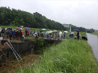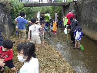 川の流れは昨年と打って変わって穏やかで、待望の「川に入れる。生き物が掬える」とまずは安堵。ただし流れている幅が昨年よりも更に狭くなっていて、全員が一斉に入れるかどうか心配したが、入ってみれば見た目よりは
