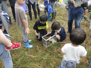 エビ類、カダヤシ、コオイムシ、ヤゴなど、次々にゲット。用意した大きい水槽の水族館がにぎわった。