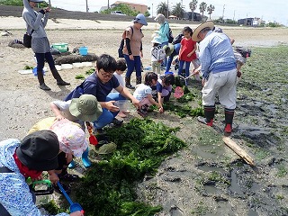 【左】オープニングセレモニー     【右】アナアオサを探り中!