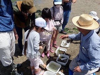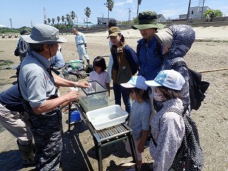 その後、捕獲した生きものを、それぞれ生きもの種類別のバット、また小魚は水槽へと移しながら「魚類」と「カニ・エビ・貝類とその他」に分けて参加者に順を追って説明を行いました。