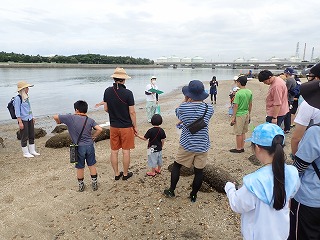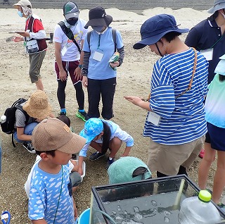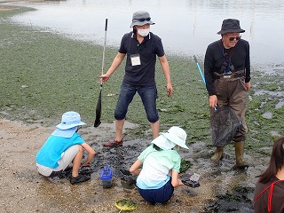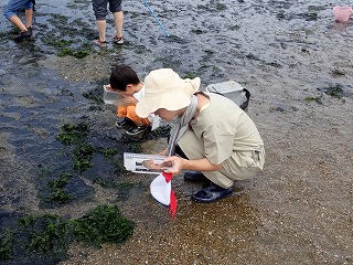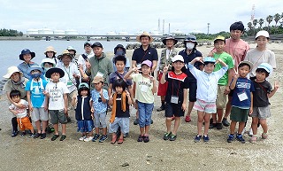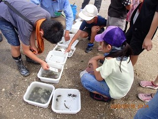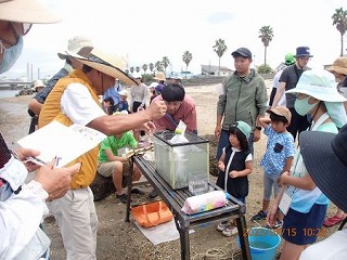 観察会の様子 【左】ミミズハゼ? 【中】ハゼをみんなで実感! 【右】カニ、ヤドカリが人気 【中】参加者の集合写真 【左】 【中】 【右】