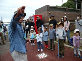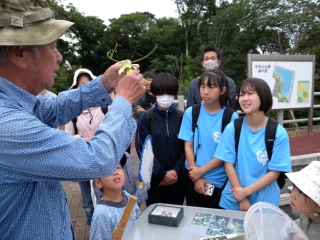 保育園児・小学校低学年児も多く参加し、それぞれ捕虫網、虫籠などを持ち捕獲した昆虫等について指導員に聞いていた。
