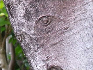 【左】クロガネモチの人面模様 【右】展望台での休憩(ティータイム)