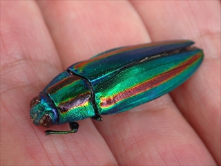 この学習の森では、水辺の環境保全や竹を切って竹灯籠を作るなどのボランティア が活動されており、今日は活動日だったため、ボランティア活動の活動の紹介や参加 の呼びかけもあった。タマムシの死骸を見せてもらうことができ、その美しさにため 息があがった。また、カラスの食べた残りかすのカブトやクワガタの体の一部があり (ノコギリクワガタ、カブトムシ)、生存していることが確認できた。