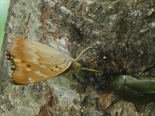 木道を進んでいくとカブト、クワガタムシが集まる木が何本かあるのだが、そこに はおらず葉の裏にひそんでいたというカブトムシを見つけ、歓声が上がった。