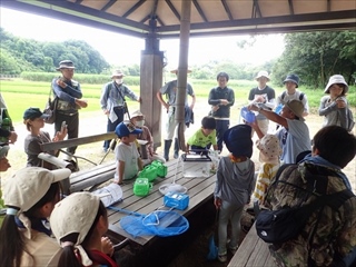 梅雨明けしたばかりで熱中症に気をつけながらの観察会。梅雨の季節に比べて湿度 は低く感じられ、日差しはきついが日陰は風が吹いてほっとできるといった日となっ た。