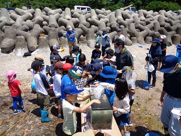 この4つだけを注意して、各自、生き物がいそうな場所で観察会がスタートしました。最後には参加者の皆さんが採取した生き物を水槽に入れてミニ水族館が完成させました。毎年、同じ時期に実施しているこの観察会は、南知多町の自然の豊かさと生物多様性を学ぶ機会として開催しており、豊浜漁業協同組合さんの特別な許可を得て実施していますので、観察会以外での採取はできませんのでご注意ください。(記:田中達)
