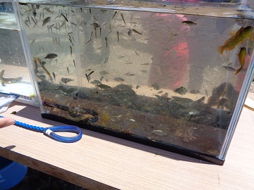 【左】採集した生き物を持ち寄っています  【右】完成したミニ水族館には色々な生き物