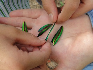 【左】タマムシ 遺骸 【中】ヤモリ 卵の中の幼生 【右】ヤモリ 卵