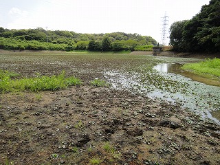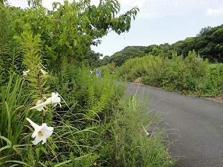 【左】散策路はタカサゴユリ開花中 【中】亀塚池 【右】亀塚池 ヒシ群生