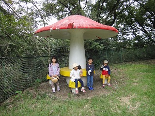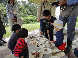 【左】キノコらしいキノコ 【右】沢山見つけたキノコに興味津々