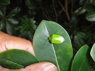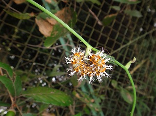 【左】ルリタテハ(幼虫) 【中】ヒヨドリバナ 【右】アオカメムシ